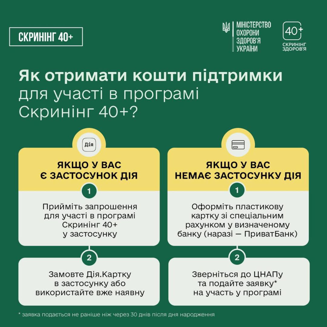 Кожна людина віком від 40 років і старше отримає запрошення на скринінг у застосунку Дія — на 30-й день після свого дня народження. Це стосується всіх українців і українок від 40 років і старше. Після прийняття запрошення необхідно замовити Дія.Картку в застосунку або ж використати свою, уже оформлену. За 7 днів на неї надійдуть кошти — 2000 гривень. Їх можна використати тільки для проходження Скринінгу здоров'я 40+.