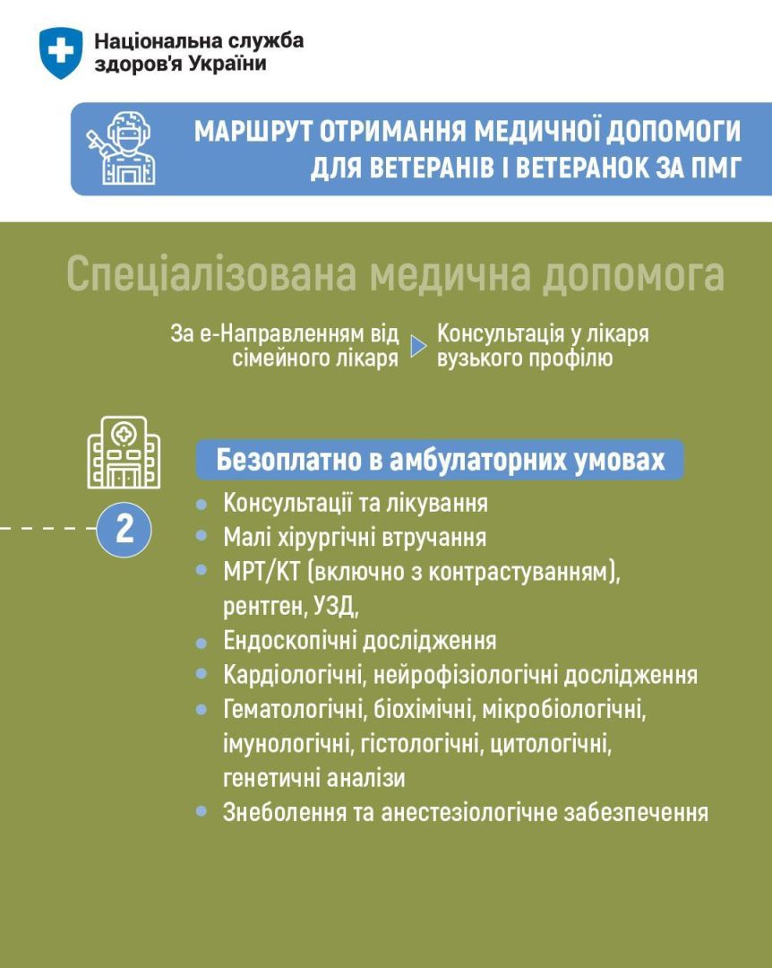 Перший і основний інструмент — Програма медичних гарантій. Через неї НСЗУ закуповує та оплачує медичні послуги для всіх громадян — незалежно від статусу, місця проживання чи віку. Тож для всіх пацієнтів, у тому числі для ветеранів і ветеранок, це означає доступ до безоплатної медичної допомоги на всіх рівнях: від первинної ланки, екстреної допомоги, консультацій лікарів вузького профілю, інструментальної діагностики, лабораторних досліджень до амбулаторного та стаціонарного лікування, хірургічних операцій, реабілітації, паліативної допомоги та ін. У 2026 році Програма медичних гарантій охоплює 46 пакетів медичних послуг.