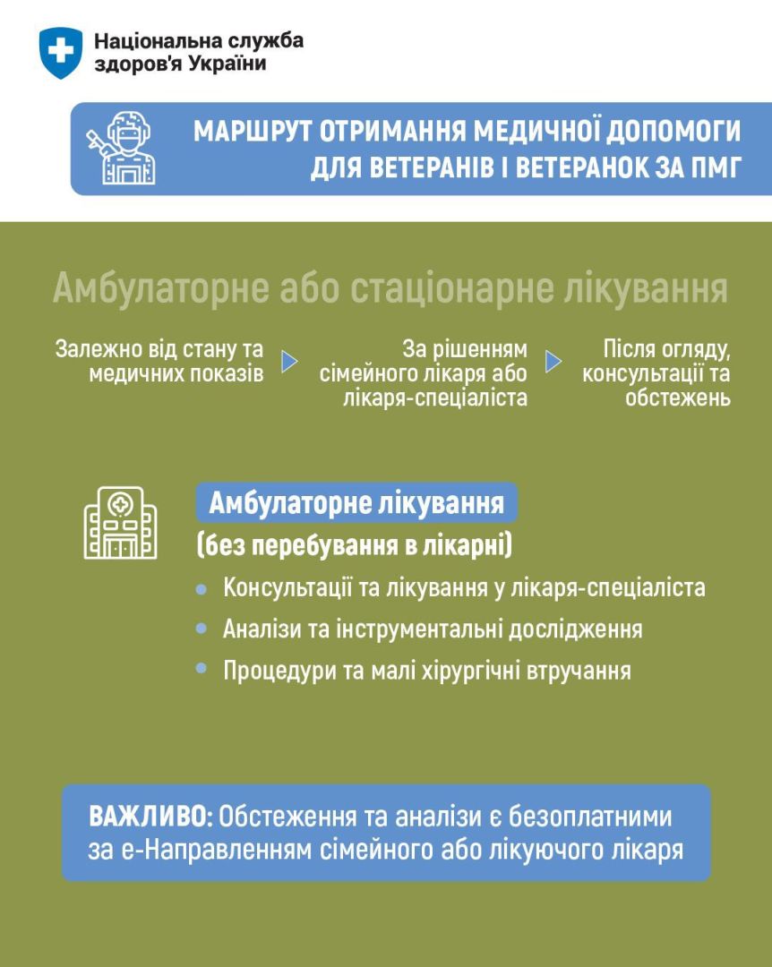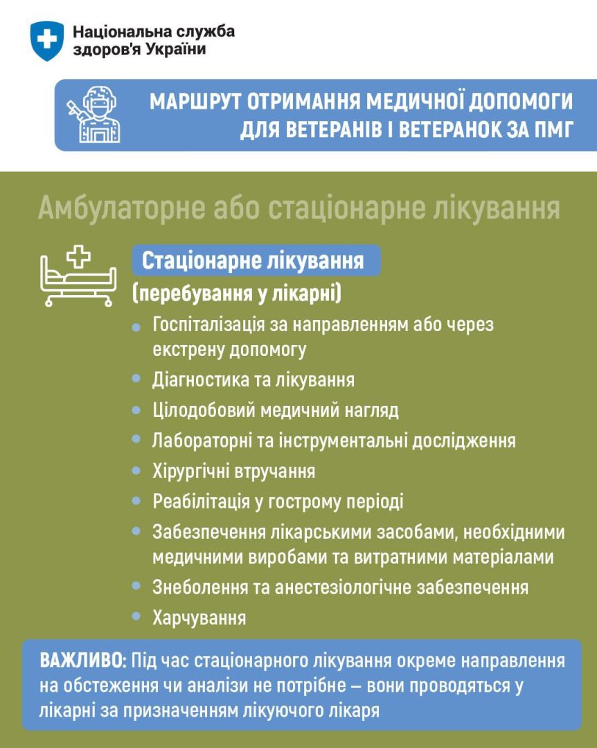 Важливо розуміти: Національна служба здоров’я України оплачує медичні послуги, що надаються закладами охорони здоров’я за договорами в межах Програми медичних гарантій, а також — проєктів для ветеранів і ветеранок, які адмініструє НСЗУ.